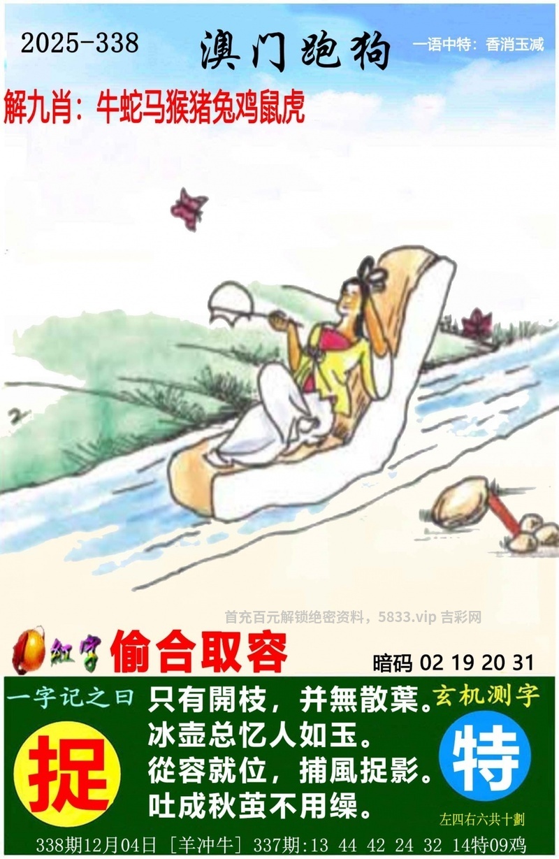 | 338期:九肖【虎鼠猴鸡兔马羊狗蛇】开:狗08准 |